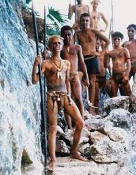 while he was out hunting. The worse part of the whole thing is that there was a ship in sight when the fire went out. Jack comes back from his hunt triumphantly carrying a pig he had just killed. Ralph isn't sure how to react to Jack's disobedience. Even though he did let the fire go out they are also very hungry. How can Ralph justify using ignominy on Jack while he also has the rest of the group's respect. The picture on the left shows Ralph and Jacks stand off, Jack on the left and Ralph on the right. Ralph's control over the group is beginning to emaciate and Ralph knows it. Ralph calls a meeting to try to reestablish the ground rules and try to stamp out the fears of the littleuns. Ralph tries to sooth so he can keep everyone calm and organized but Jack wants to be leader and wants chaos and discord, his new respect as hunter is causing a power struggle between Ralph and Jack. The picture on the right shows the growing change in Jack's character. Jack always wanted to be leader but was willing to follow Ralph and his rules until he realized his new personality. Jack explains his paranoia to his fellow hunters expressing his awkwardness in his own skin. Jack draws himself a new face with clay covering his own and with it becomes the savage hunter willing to hunt and kill. With his new face Jack's hunger for power increases and he attempts to use the littleun's fear of the beast to create chaos so that he can come in as the new leader and kill the beast. Jack's blood thirst to kill seems to comfort the littleun's more than Ralph's continual existence that there isn't a beast. The picture below shows Jack's new found aggression in hunting and even his own success Monday, September 19, 2011